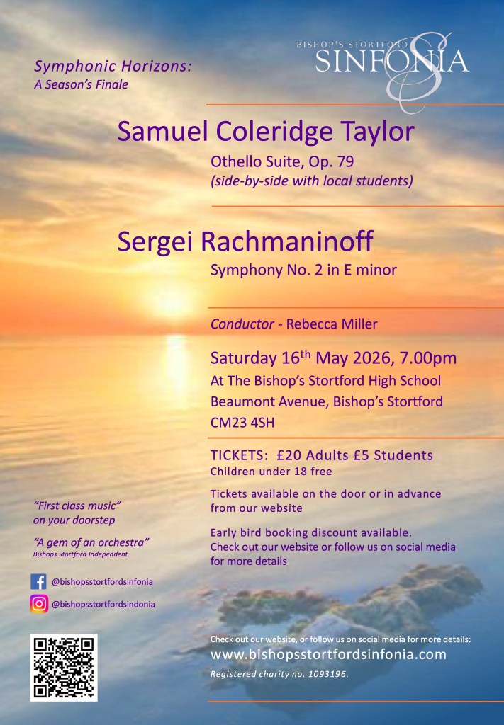 This evening opens with Samuel Coleridge-Taylor’s dramatic Othello Suite, performed side-by-side with talented local music students. This collaboration offers young musicians from Bishop’s Stortford and the surrounding area the opportunity to share the stage with the Sinfonia, highlighting the next generation of orchestral talent and reflecting the orchestra’s commitment to supporting music-making in the community.