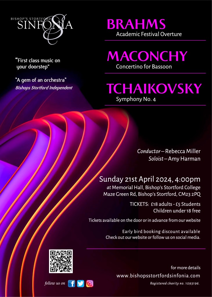 Bishop’s Stortford Sinfonia is closing its 2023/24 season with a show-stopping afternoon of music, with a special focus on the bassoon. The Sinfonia is delighted to welcome Amy Harman, principal bassoonist of Aurora Orchestra, who will be performing the Maconchy Concertino for Bassoon, a perfect piece to show-off this often-overlooked instrument.