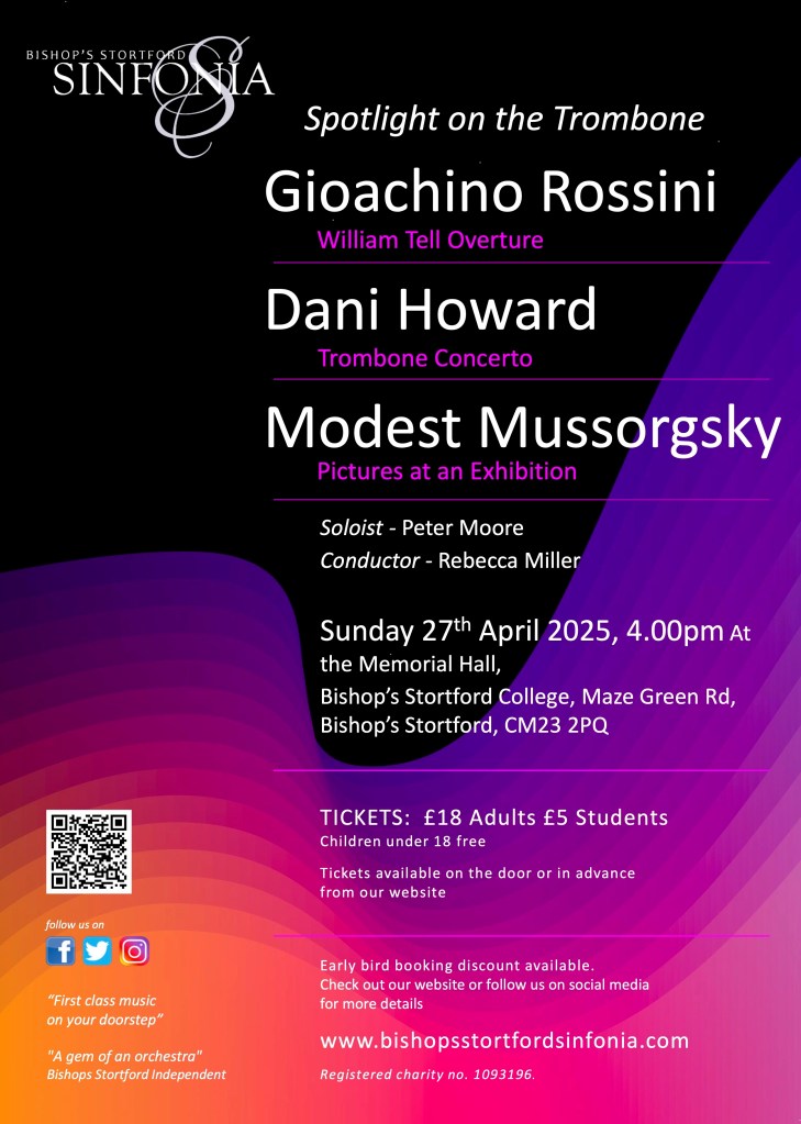 Bishop’s Stortford Sinfonia is closing our 2024-25 season with a blockbuster afternoon of music that puts a well-deserved spotlight on the trombone. Following a rousing start to the concert with the ‘William Tell Overture’, we are thrilled to be welcoming the unparalleled Peter Moore to perform Dani Howard’s masterful Trombone Concerto, a work that was written for Peter. This concerto was the winner of the Royal Philharmonic Society Award in 2021 and it will be a treat to hear it performed by a world-class trombonist.
