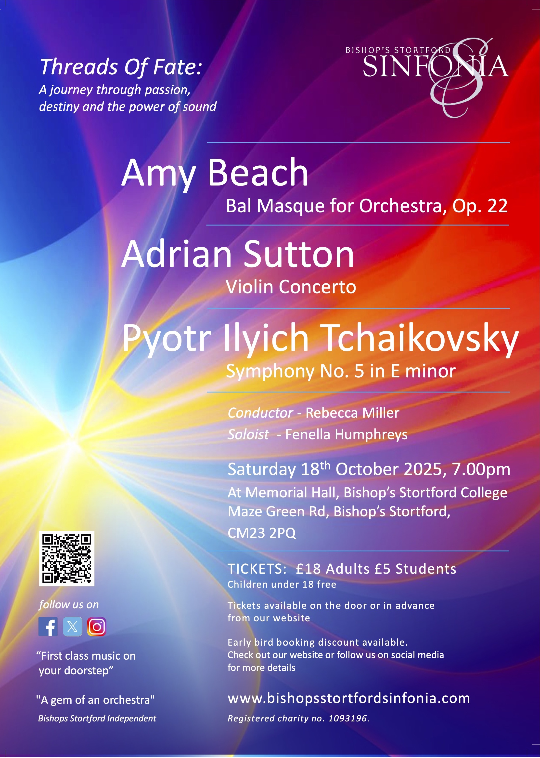The Sinfonia proudly opens its 2025/26 season with Threads of Fate, a concert that also marks the orchestra’s 10th Anniversary. This milestone year begins in celebratory style with Amy Beach’s sparkling Bal Masque, a vibrant work alive with dazzling colour, elegance, and the joy of dance. The spotlight then turns to Adrian Sutton—best known for his acclaimed music for the National Theatre’s War Horse. His striking Violin Concerto, written for and premiered by the brilliant Fenella Humphreys in 2023, combines lyrical beauty with compelling drama, offering a fresh and deeply expressive voice for the instrument.